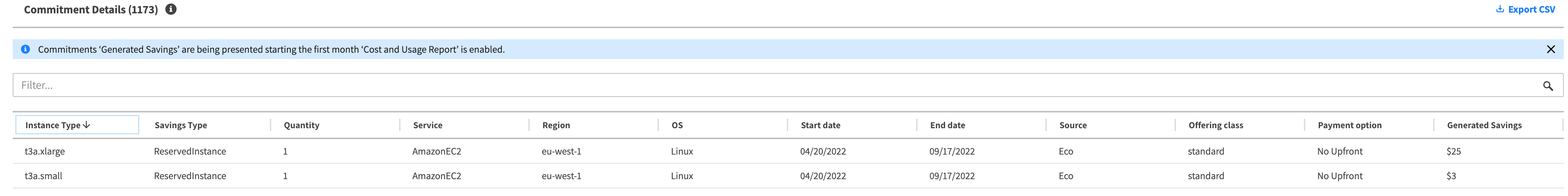 • Generated savings: The amount the commitment saved over using on-demand instances and reservations.