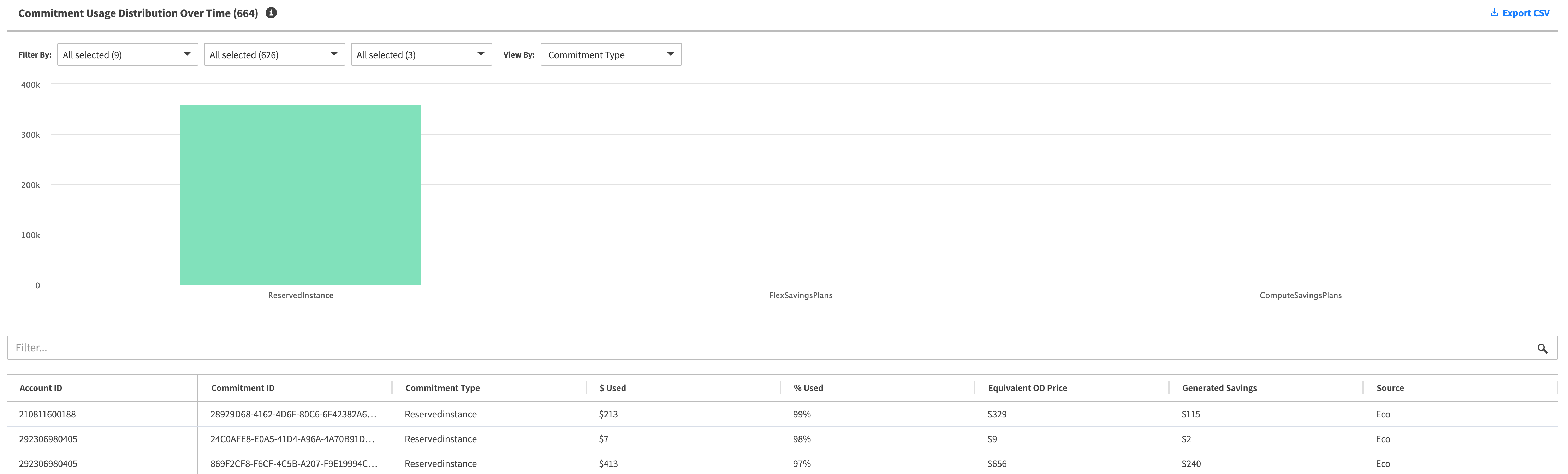 Eco provides summary graphs and charts that give you a broad perspective on your savings and commitments, allowing you to easily filter them. These graphs are displayed: