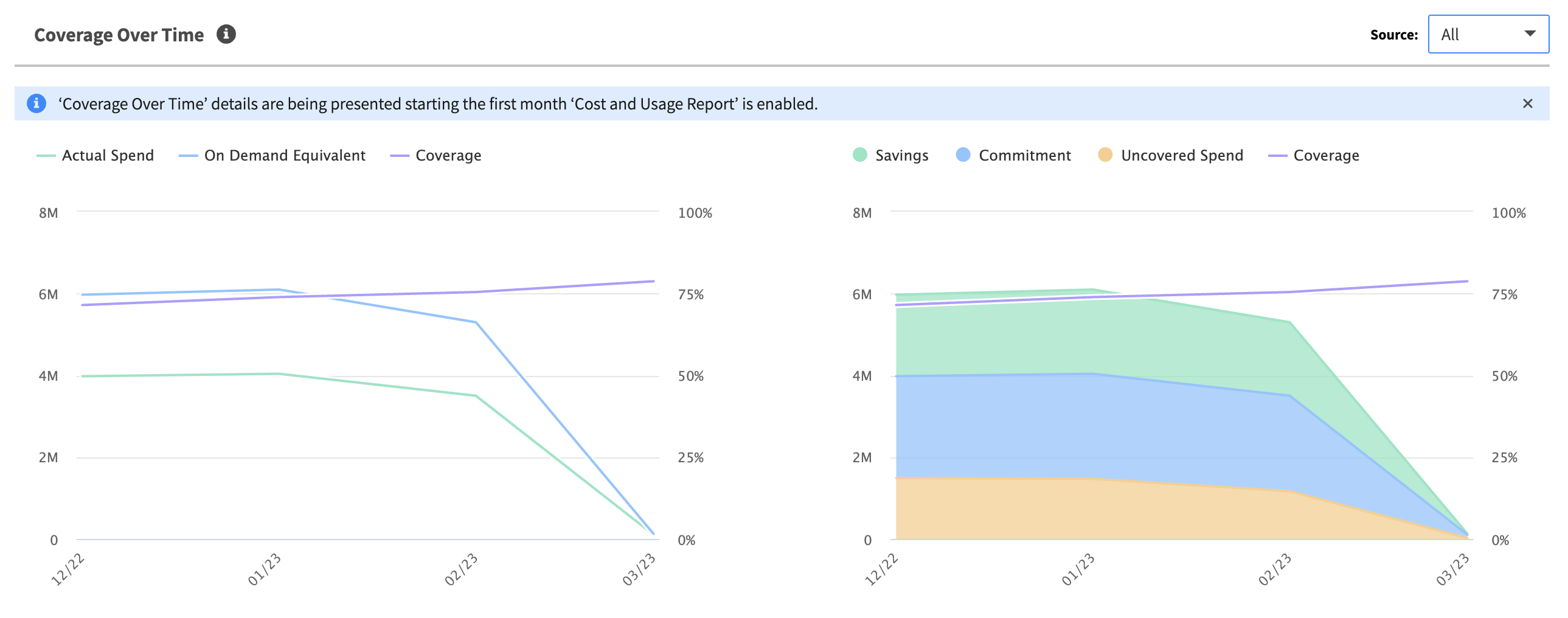 The coverage calculation considers dollars or your investment used instead of hours, which differs from AWS Cost Explorer. For actual spend, the calculation only considers what is reservable for a service (e.g., Eco only uses the on-demand purchase option, with the Running Hours usage type groups and the Usage charge type). You can use the source filter specific to the Coverage Over Time graph.
