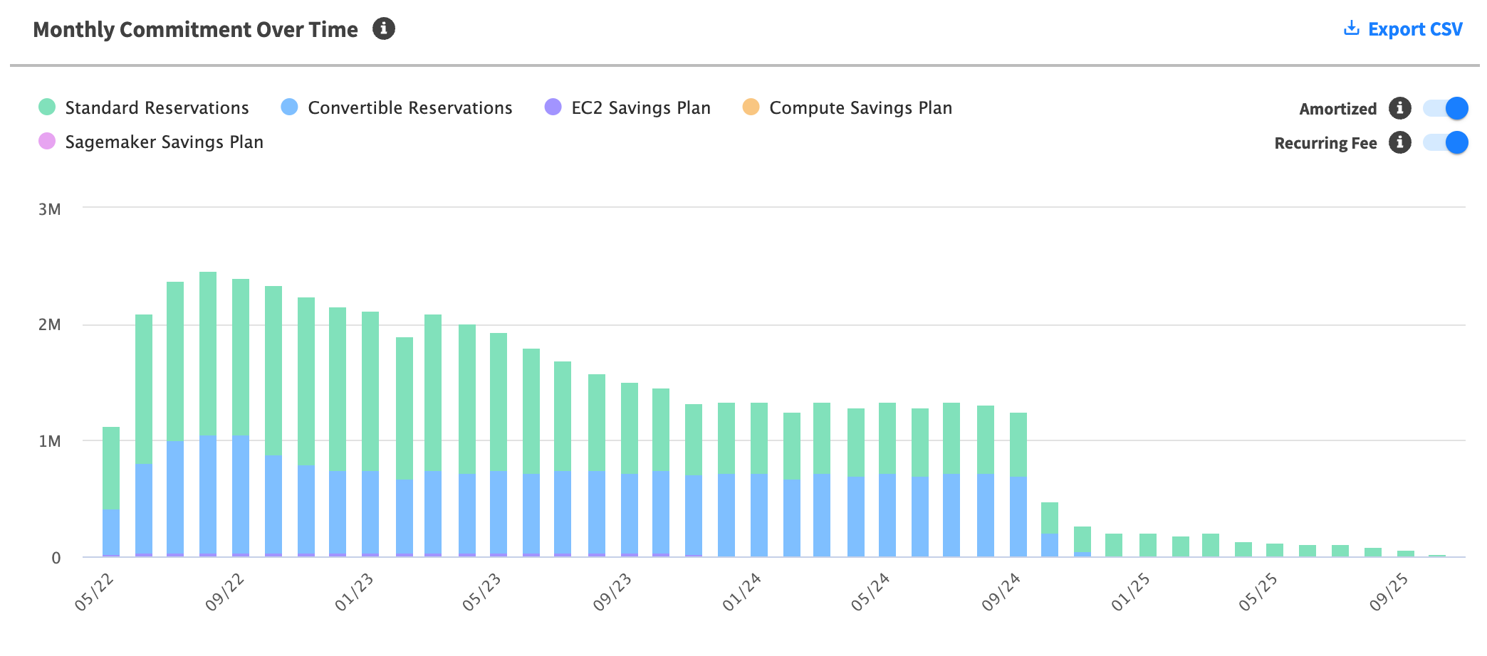 A bar graph showing your reserved instance and monthly savings plan commitment broken down into Standard Reservations, Convertible Reservations, and Pending Reservations, plus Compute and EC2 savings plans. To view the up-front fees from an amortized view and the recurring fees, turn on the view accordingly in the top right. Regardless of the data range that is selected in the date filter, this graph remains static and can provide information six months back and thirty-six months into the future.