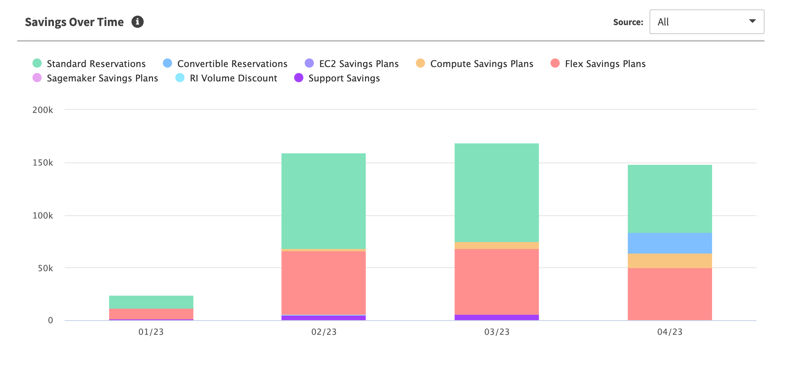 A bar graph shows each month's savings amount broken down by type of savings from reservations and savings plans. You can use the filters at the top of the page, and source filters specific to each graph.